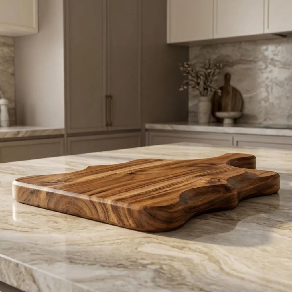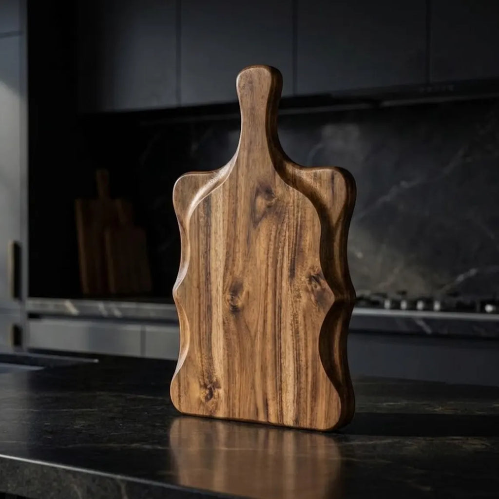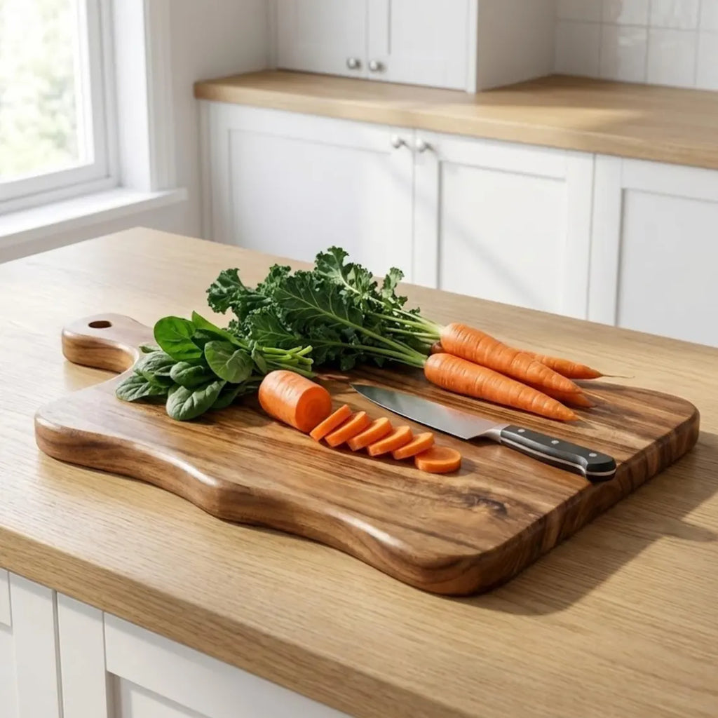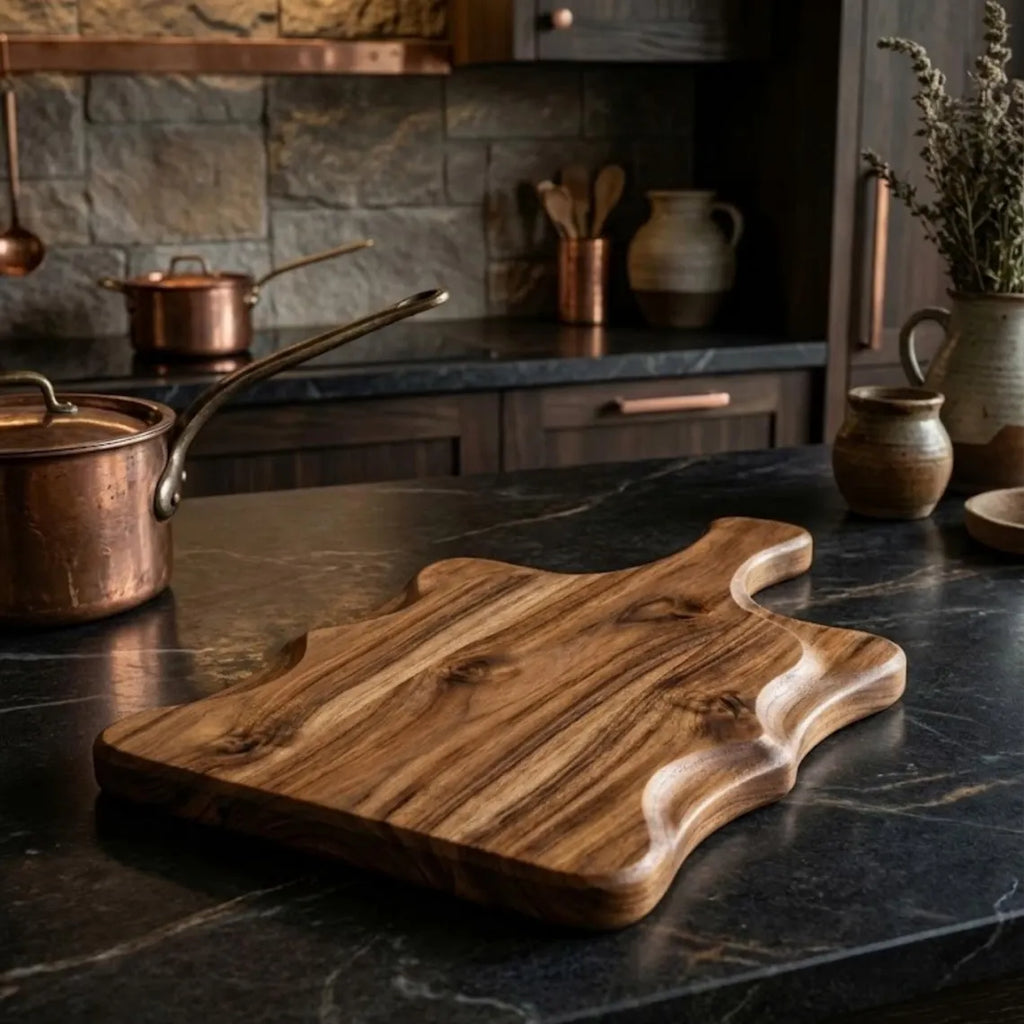 Bring warmth and character into your kitchen with this handcrafted acacia wood chopping board, thoughtfully designed with beautiful sculpted sides and an ergonomic handle. This board is more than a kitchen tool—it’s a functional piece of natural art made to be used, displayed, and admired.