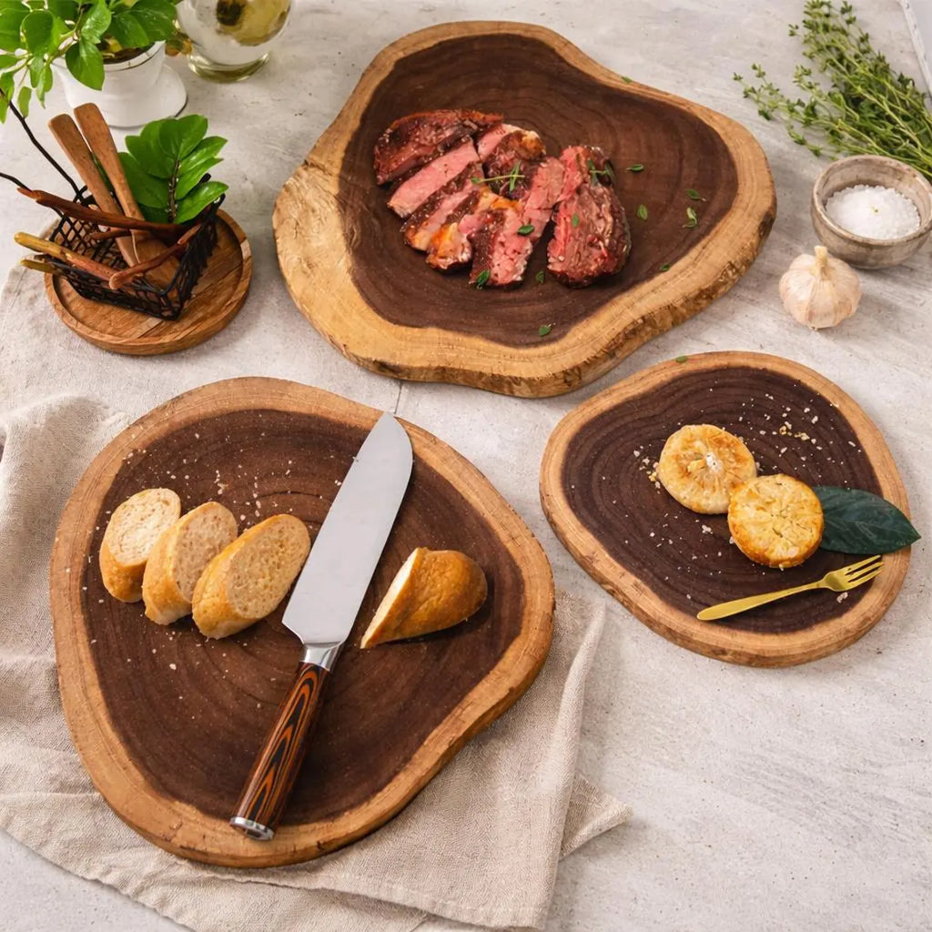 Add timeless character to your kitchen or dining space with this handcrafted acacia wood chopping and serving board. Made from 100 percent natural acacia wood, each board highlights unique grain patterns, growth rings, and an organic live edge, ensuring that no two pieces are ever the same.
